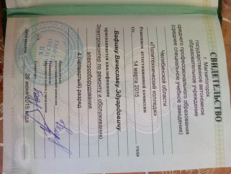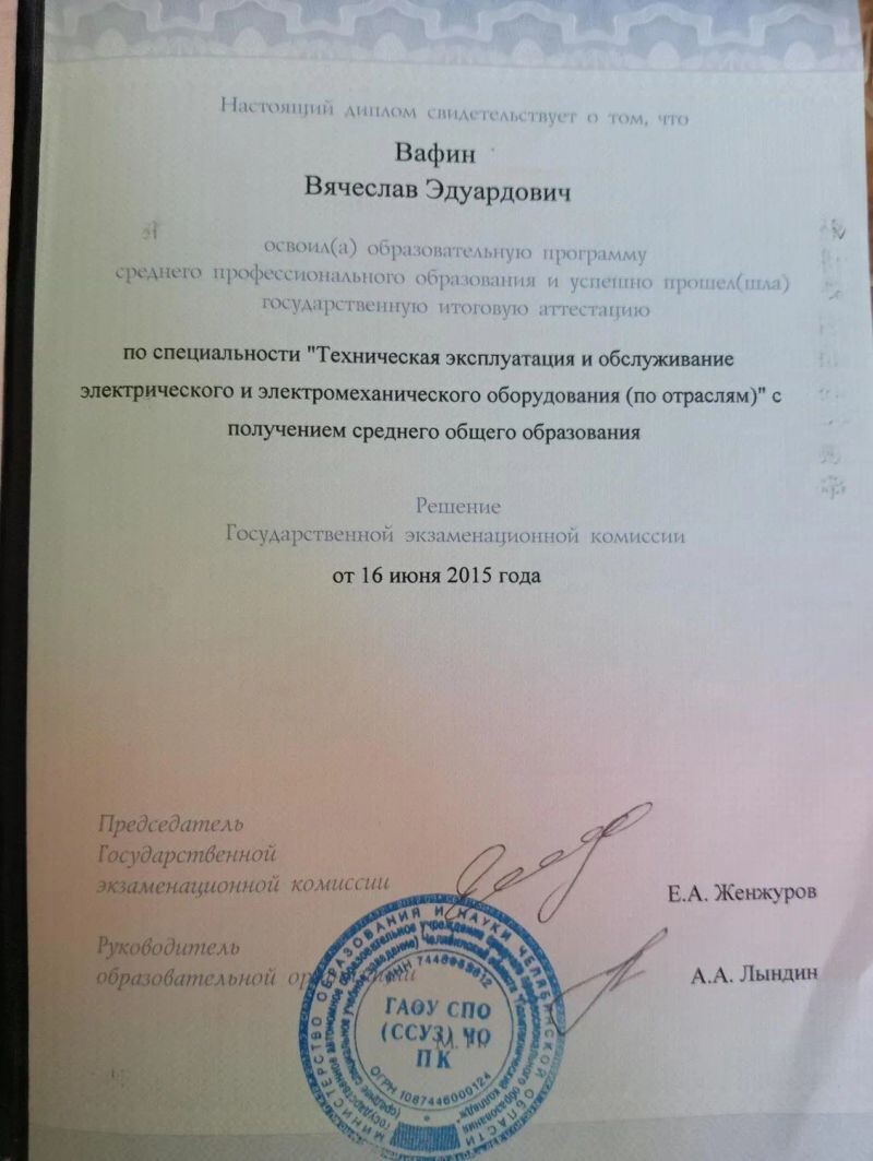 - ГАОУ СПО (ССУЗ) ЧО «Политехнический колледж, квалификация «электромонтёр по ремонту и обслуживанию электрооборудования 4 разряд», 2011–2015 гг.
