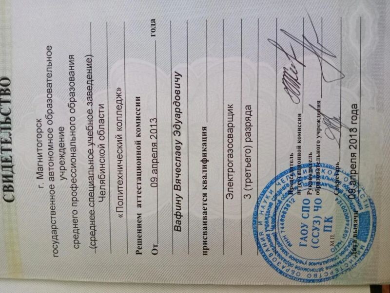 - ГАОУ СПО «Политехнический колледж», квалификация «электрогазосварщик 3 разряда», 2012–2013 гг.