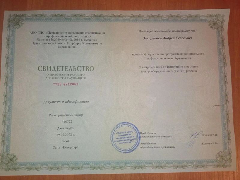 - АНО ДПО «Первый центр повышения квалификации и профессиональной подготовки», электромеханик по испытания и ремонту электрооборудования 5 разряда, 2022 г.