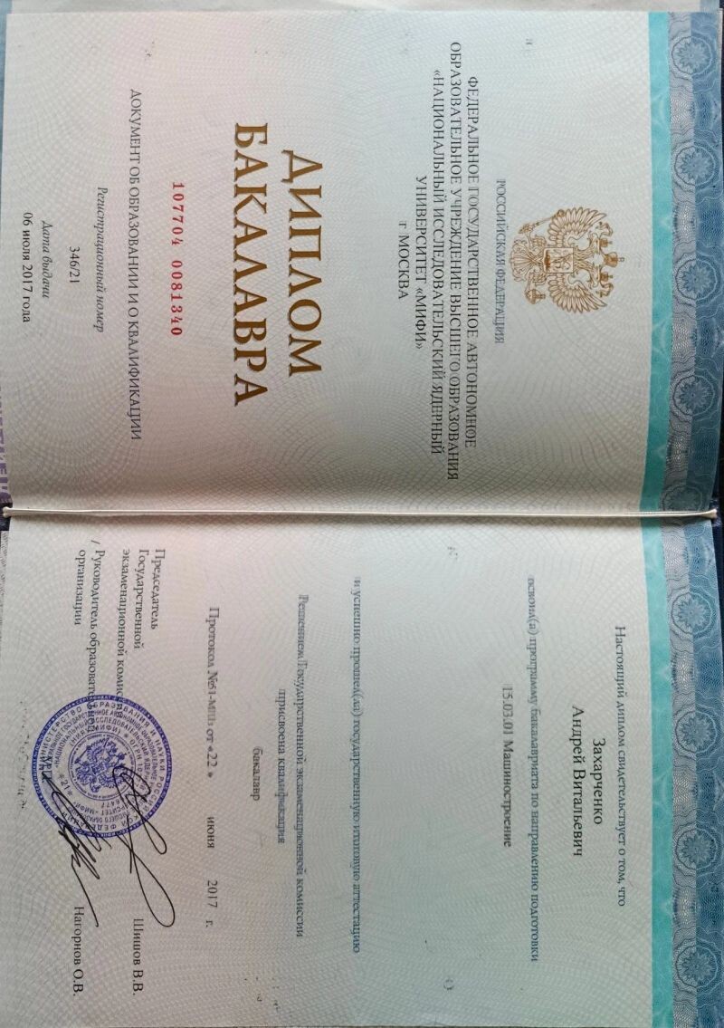 - Национальный исследовательский ядерный университет «МИФИ», машиностроение, 2014–2017 гг.