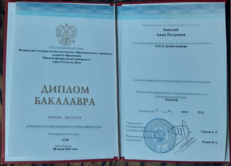 - Южный федеральный университет, программа «Дизайн интерьера», бакалавр, 2016 г.