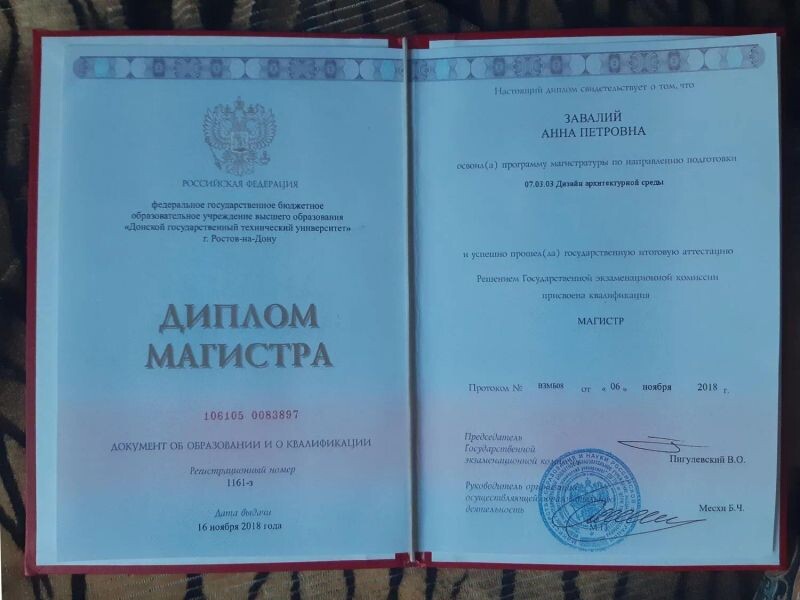 - Донской государственный технический университет, программа «Дизайн архитектурной среды», магистр, 2018 г.