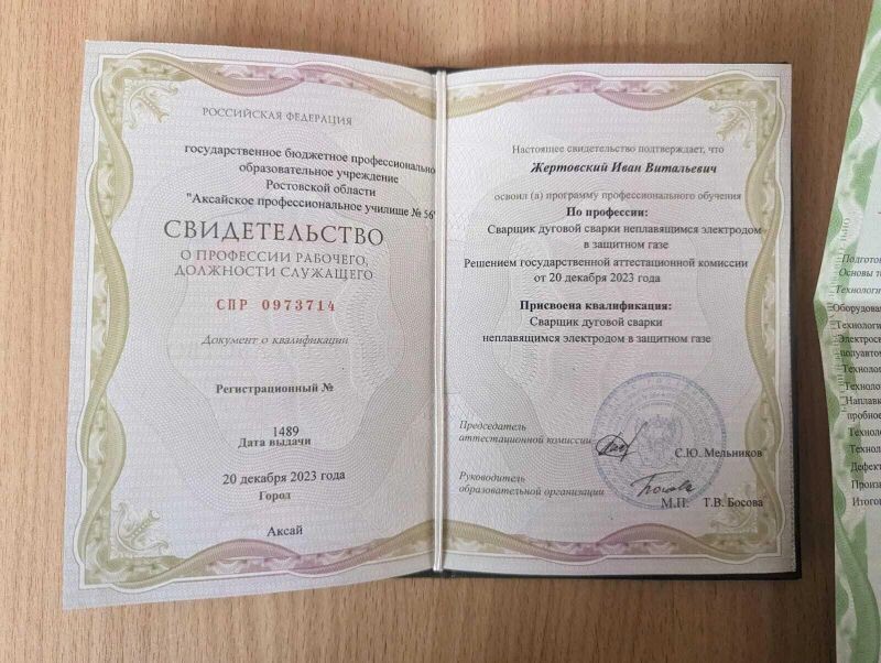 - Аксайское профессиональное училище № 56, квалификация «сварщик дуговой сварки неплавящимся электродом в защитном газе», 2022–2023 гг.