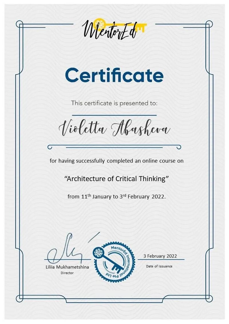 - Курсы «Архитектура критического мышления» по сингапурской системе Лилии Мухаметшиной, 2022 г.