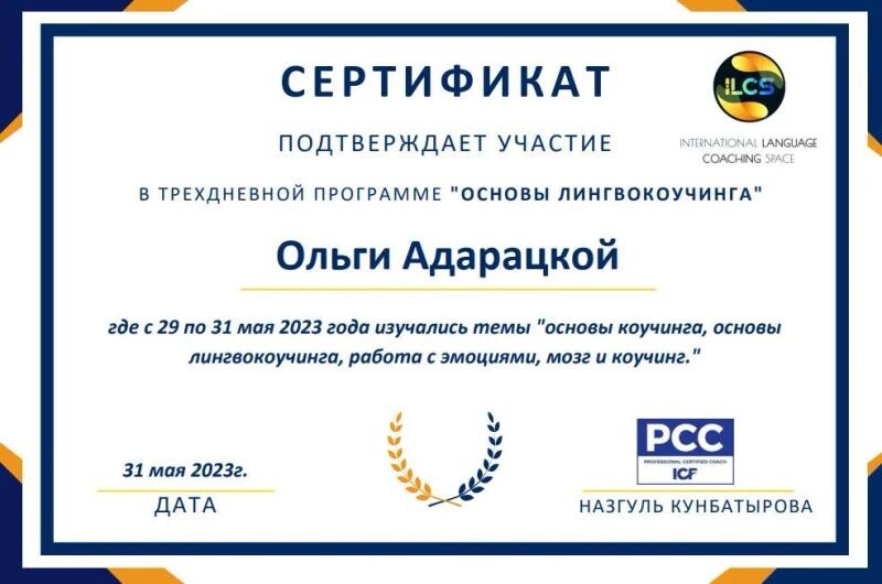 - International Language Coaching Space, программа «Основы лингвокоучинга», 2023 г.
