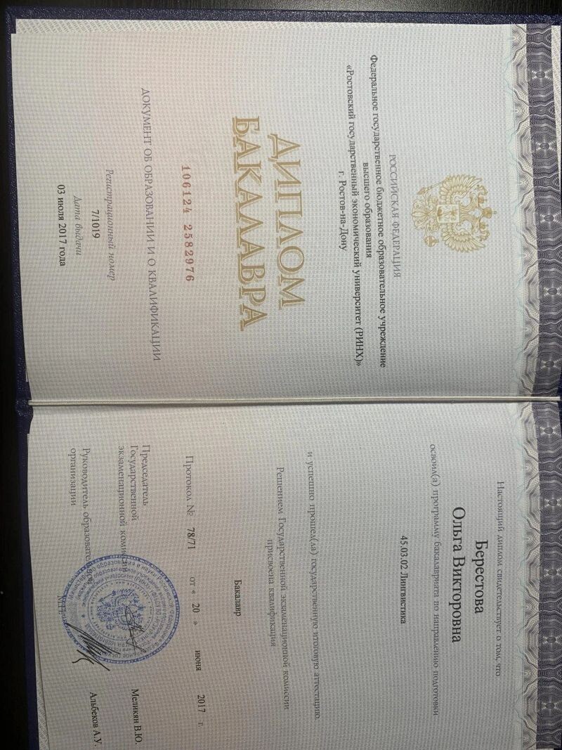 - Южный федеральный университет, переводчик в сфере профессиональной коммуникации, 2012–2016 гг.