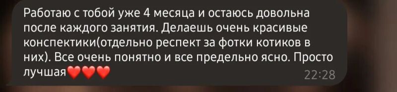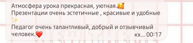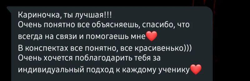 Урок был очень интересный, презентации красивые. Очень удобно, что не нужно ничего переписывать, так как Карина Николаевна скидывает все конспекты и домашнюю работу на платформу. Думаю, что мы обязательно продолжим заниматься 🥰