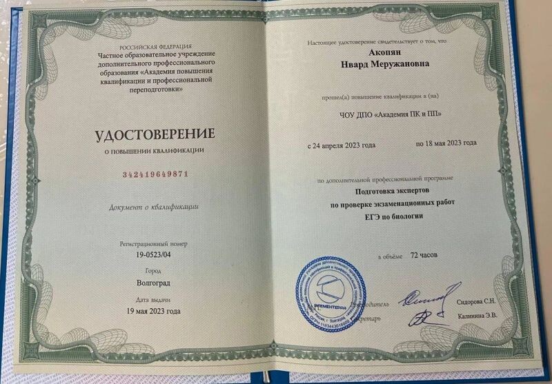 - ЧОУ ДПО «Академия ПК и ПП», программа «Подготовка экспертов по проверке экзаменационных работ ЕГЭ по биологии», 2023 г.