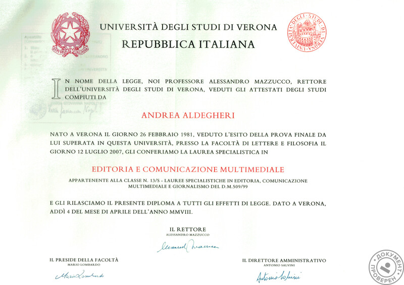 - Университет Вероны (Италия), диплом магистра по специальности «издательство и коммуникации мультимедиа», 2007 г.