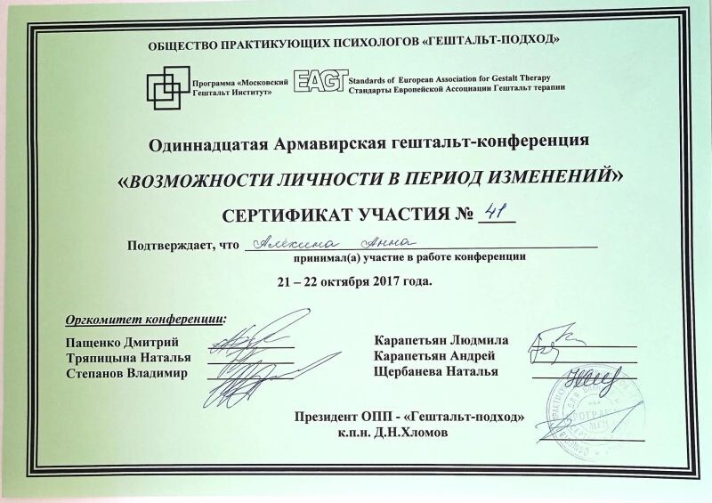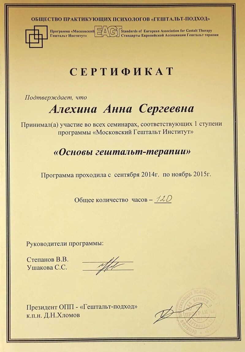- Московский гештальт институт, основы гештальт-терапии, 2014–2015 гг.
