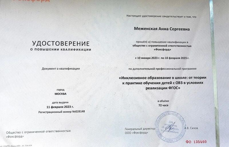 - ООО «Фоксфорд», инклюзивное образование в школе: от теории к практике обучения детей с ОВЗ в условиях реализации ФГОС, 2023 г.