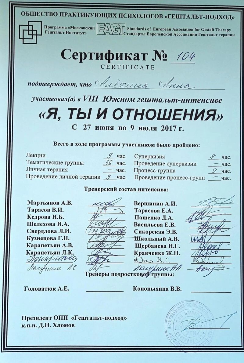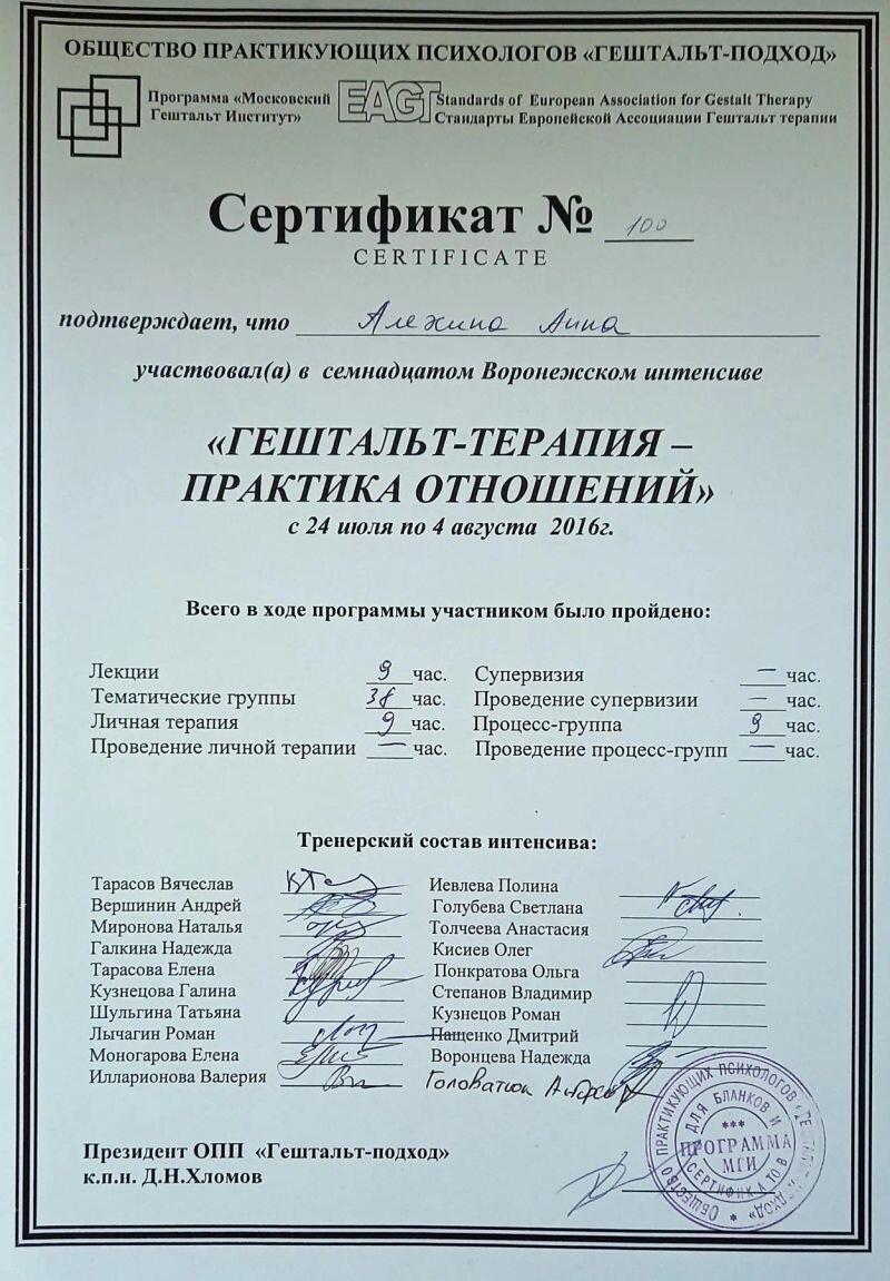 - Московский гештальт институт, интенсив «Гештальт-терапия — практика отношений», 2016 г.