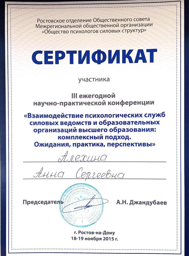- Общество психологов силовых структур, III научно-практическая конференция, 2015 г.