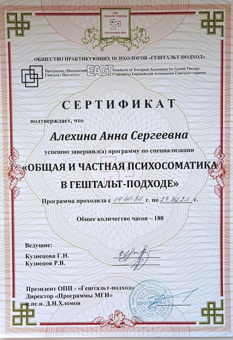 - Московский гештальт институт, общая и частная психосоматика в гештальт-подходе, 2020–2022 гг.