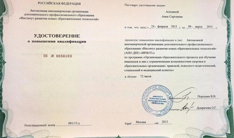 - АНО ДПО «ИРНОТ», организация образовательного процесса для обучения инвалидов и лиц с ограниченными возможностями здоровья в образовательных огранизациях, 2015 г.