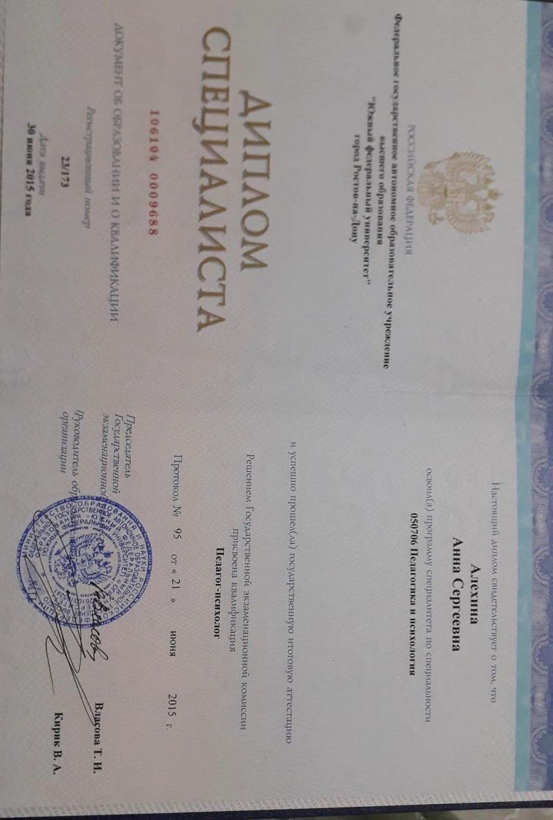 - Южный федеральный университет, педагогика и психология, 2009–2015 гг.