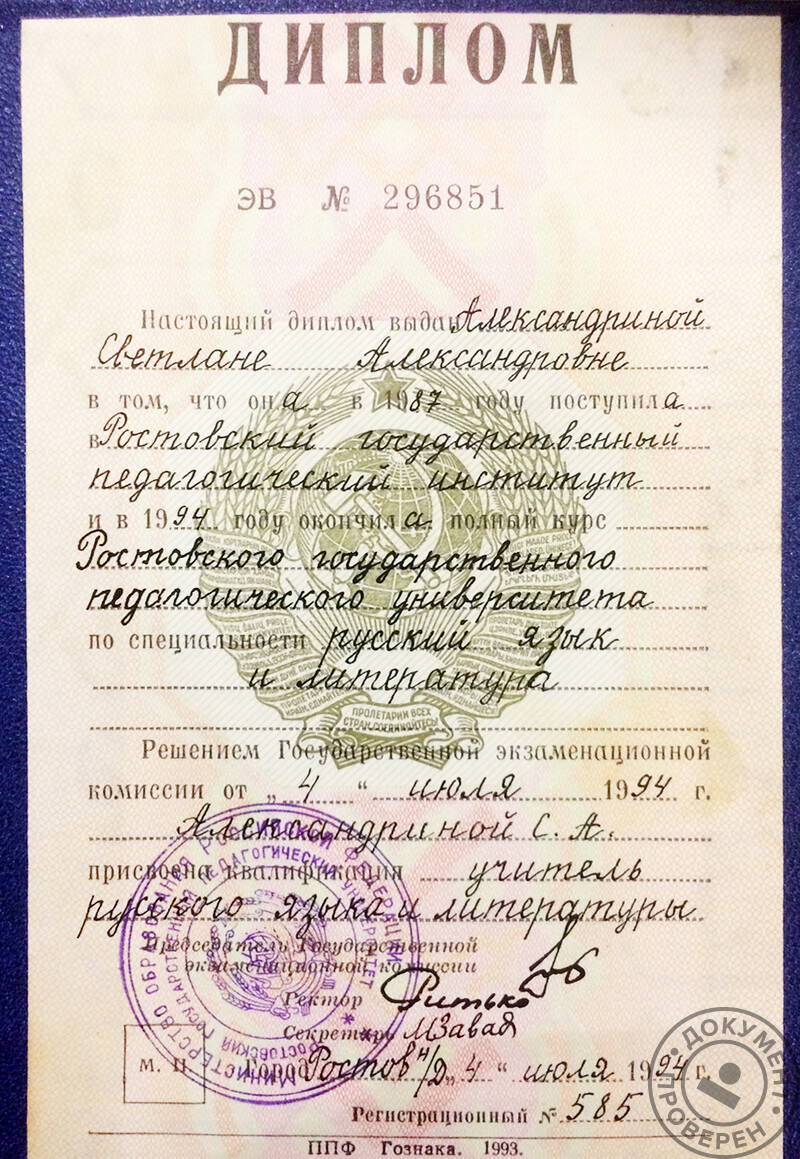 - Ростовский государственный педагогический университет, квалификация – учитель русского языка и литературы (1994 г.).