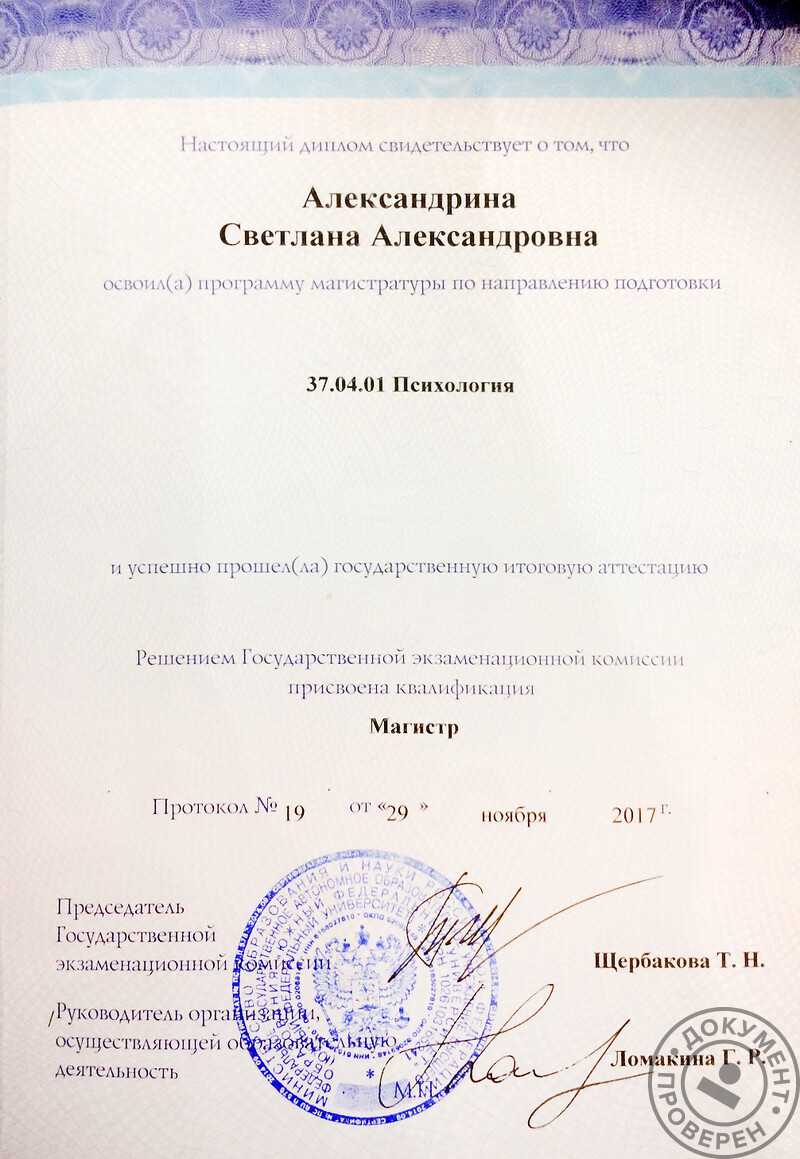 - Южный федеральный университет, магистр психологии (2017 г.).