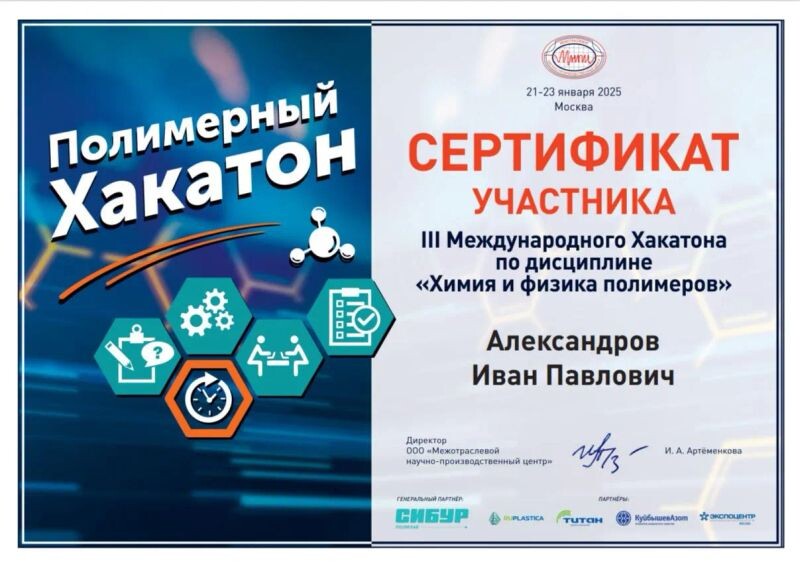 - ООО «Межотраслевой научно-производственный центр», сертификат участника III Международного Хакатона по дисциплине «Химия и физика полимеров», 2025 г.