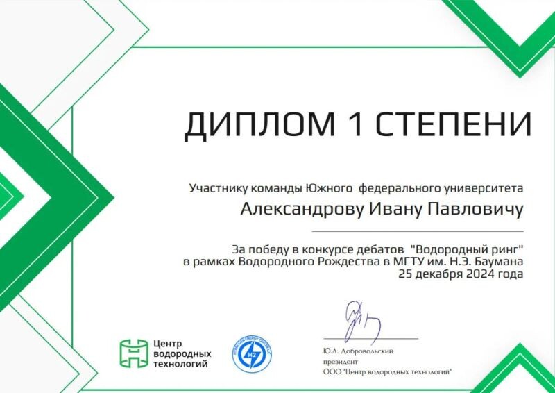 - ООО «Центр водородных технологии», диплом 1 степени за победу в конкурсе дебатов «Водородный ринг» в рамках Водородного Рождества в МГТУ им. Н.Э. Баумана, 2024 г.