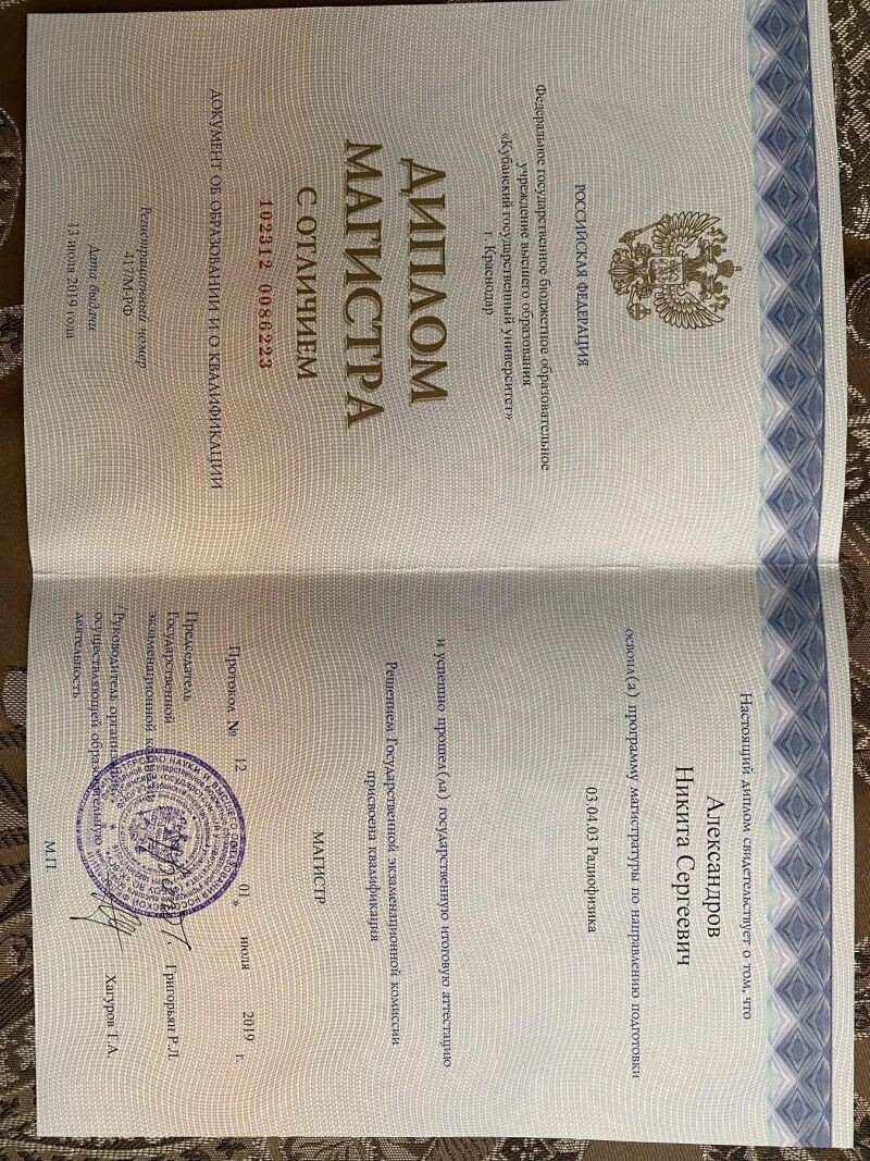 - Кубанский государственный университет, радиофизика, магистр, 2017–2019 гг.