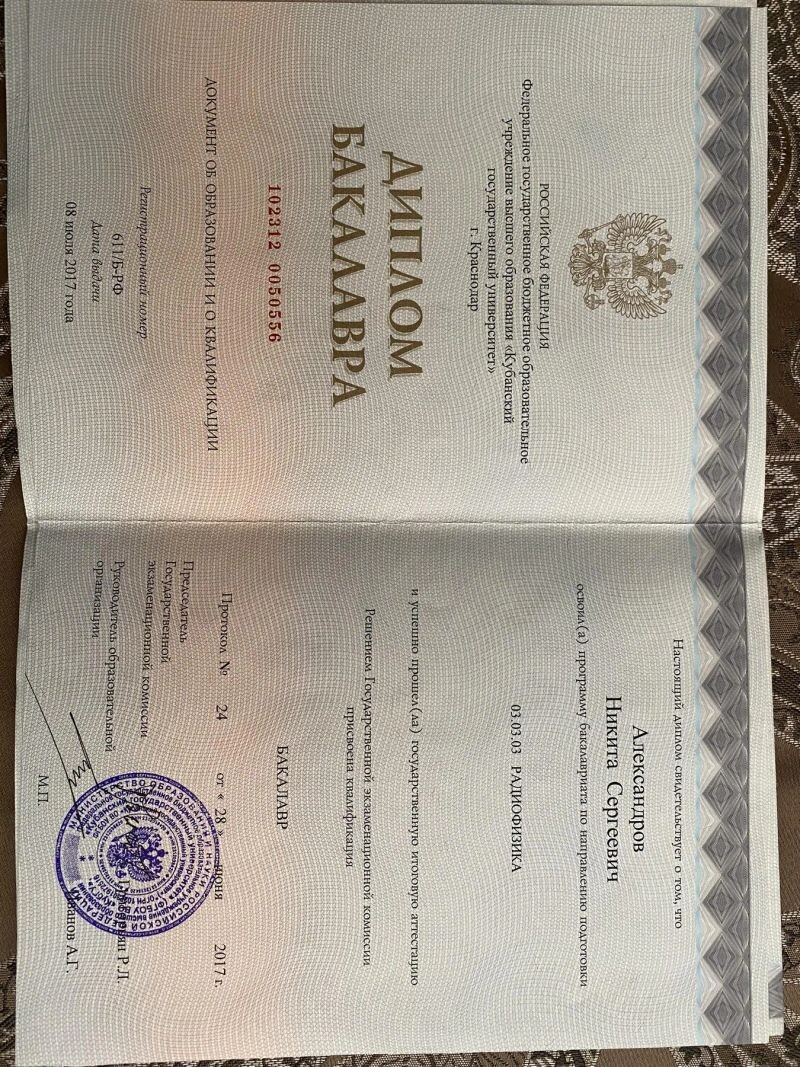 - Кубанский государственный университет, радиофизика, бакалавр, 2013–2017 гг.