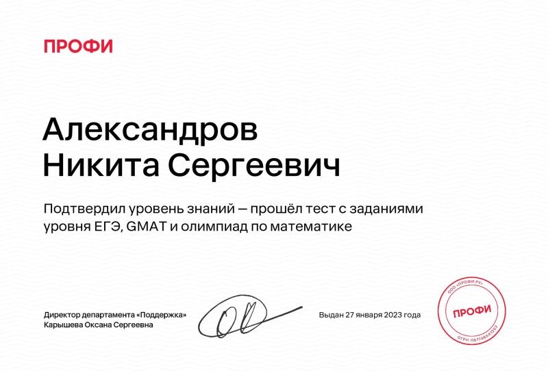 - Подтвердил уровень знаний — Прошёл тест с заданиями уровня ЕГЭ, GMAT и олимпиад по математике (с 2023 г.).