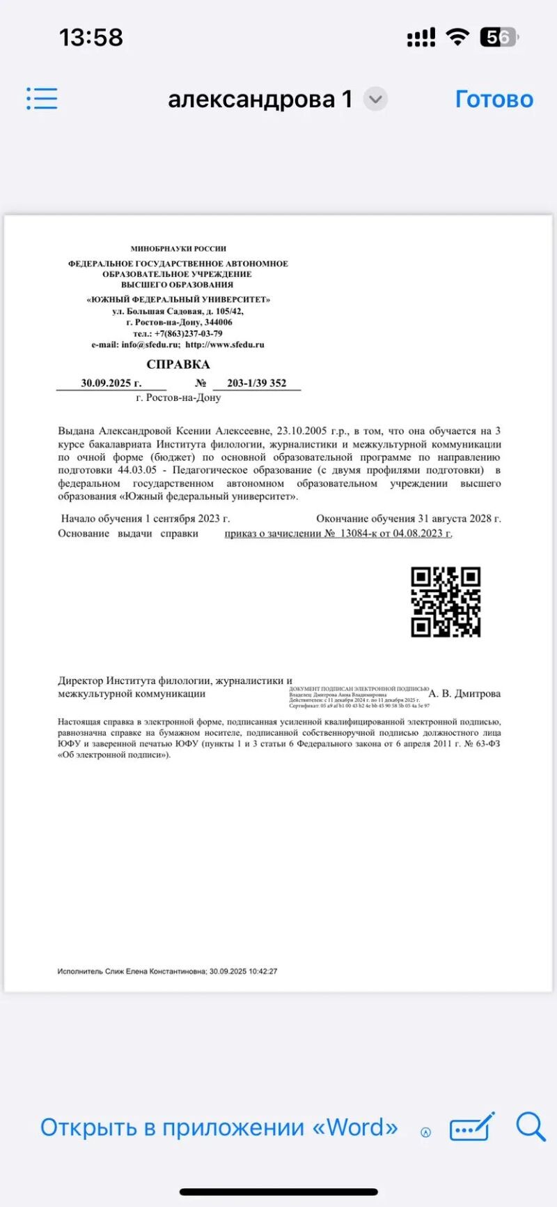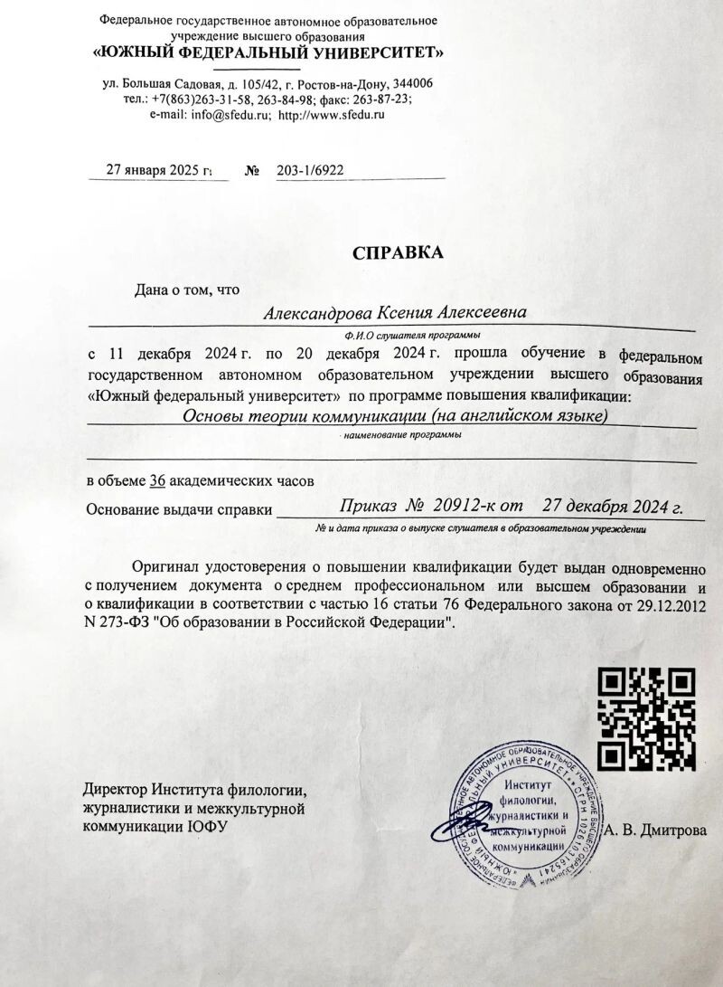 - Справка об обучении в лучшем вузе юга. Педагог с двумя профилями Английский язык+ Французский язык (с 2025 г.).