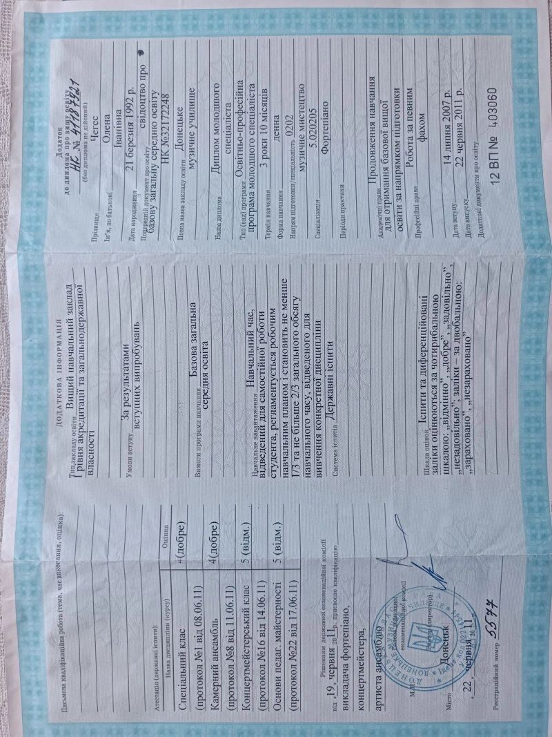 - Донецкое музыкальное училище, факультет музыкальное искусство, специальность преподаватель фортепиано, концертмейстер, артист ансамбля, 2007–2011 гг.