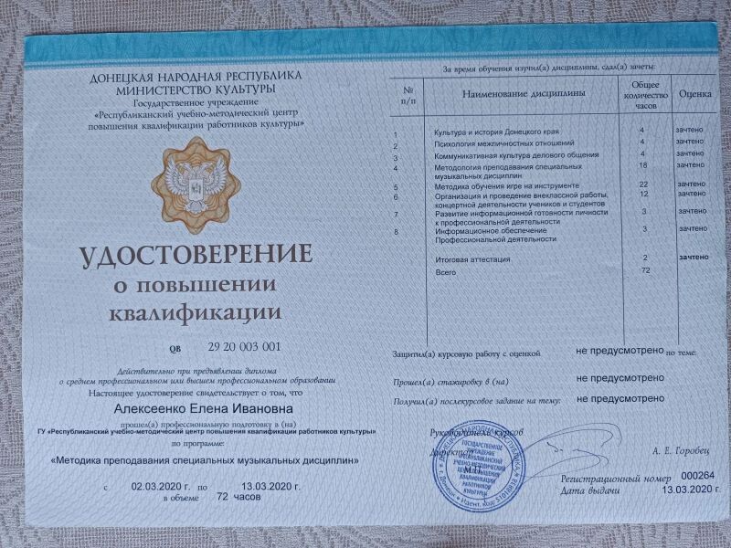 - ДНР курсы повышения квалификации по программе " Методика преподавания специальных музыкальных дисциплин" (с 2020 г.).