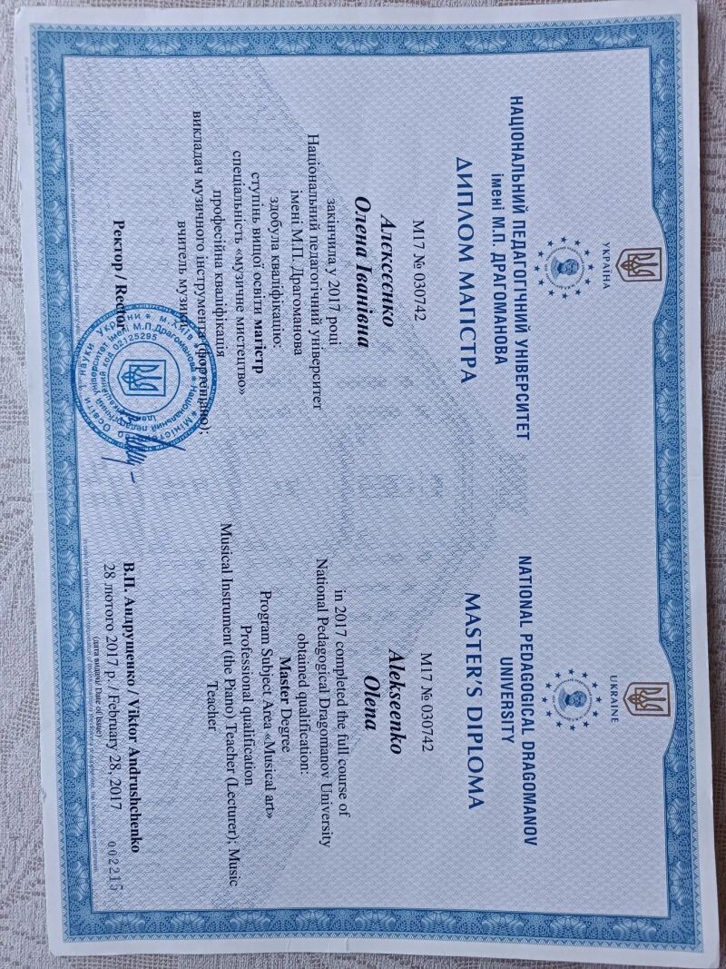 - Национальный педагогический университет им. М. П. Драгоманова, факультет «музыкальное искусство», специальность «преподаватель музыкального инструмента "фортепиано"», 2011–2017 гг.