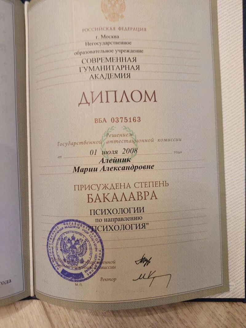 - Современная гуманитарная академия, психология, 2004–2008 гг.