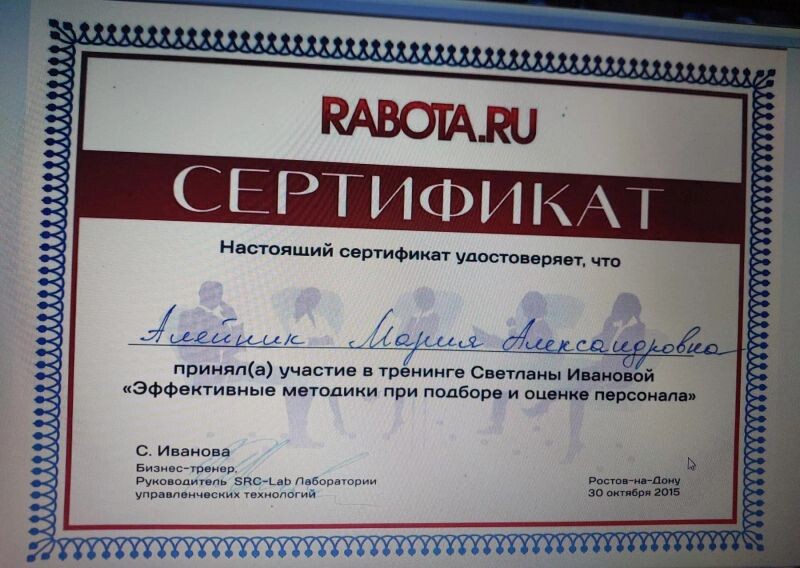 - Светлана Иванова, тренинг «Эффективные методики при подборе и оценке персонала», 2015 г.