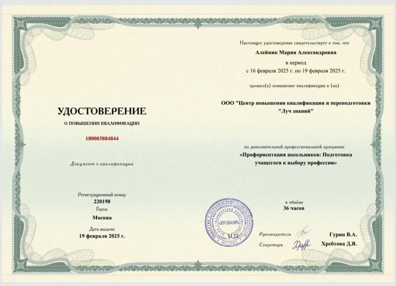 - Центр повышения квалификации и переподготовки «Луч знаний», программа «Профориентация школьников: подготовка учащегося к выбору профессии» (36 ч.), 2025 г.