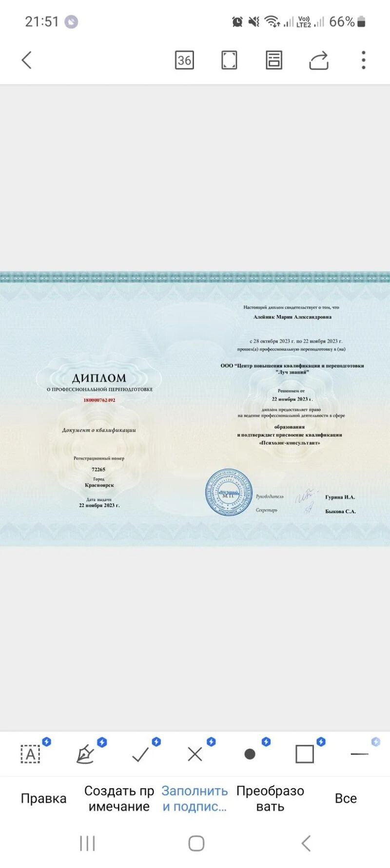 - Центр повышения квалификации и переподготовки «Луч знаний», психолог-консультант, 2023 г.