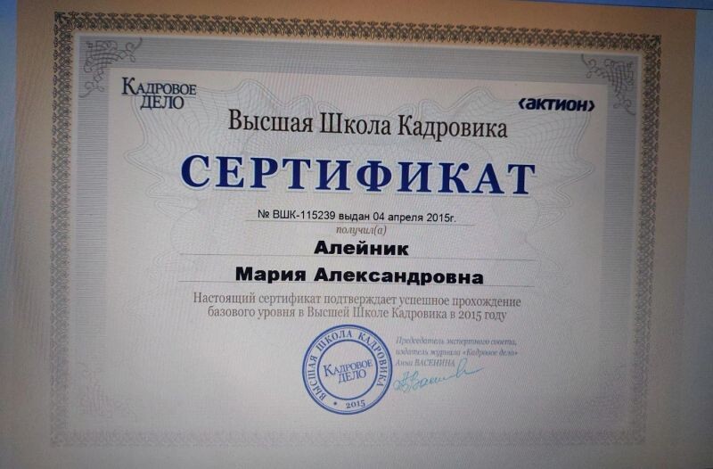 - Высшая школа кадровика, программа базового уровня, 2015 г.