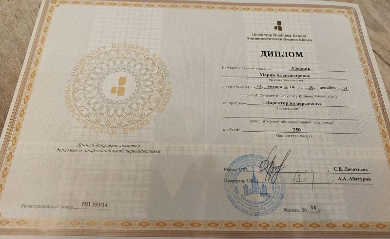 - Университетская бизнес-школа, программа «Директор по персоналу», 2014 г.