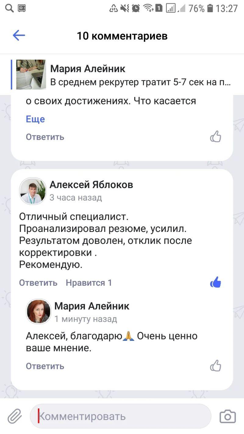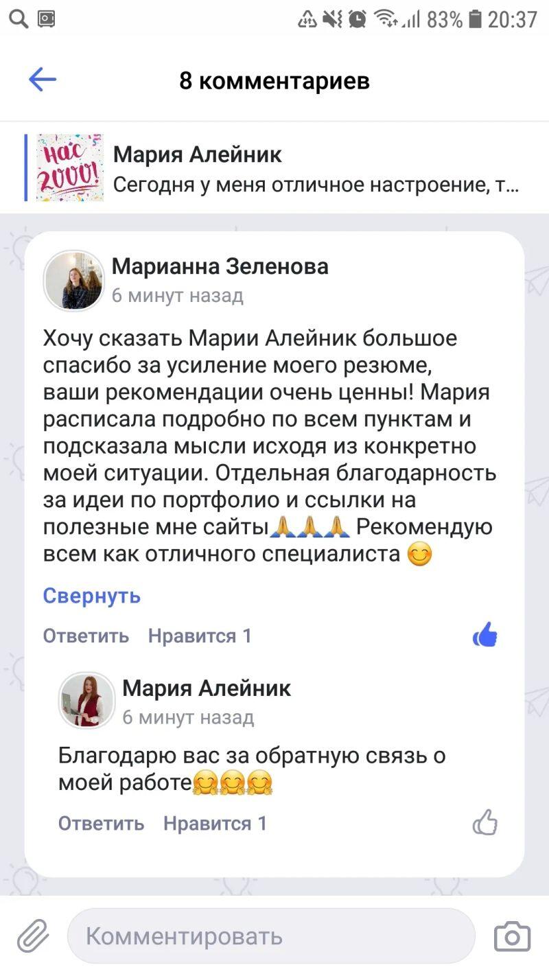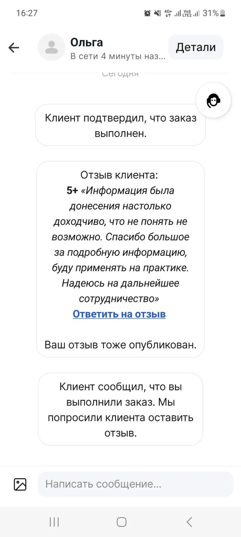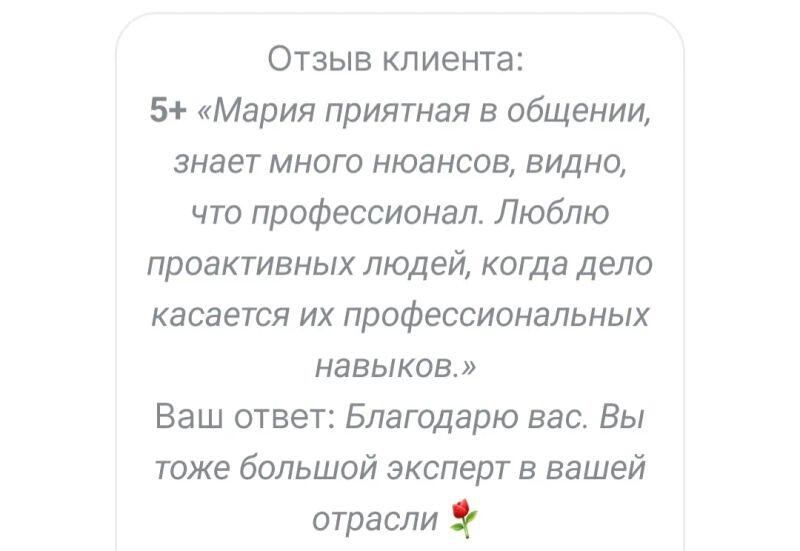 Согласно отзывам 💬 о специалисте, Мария демонстрирует высокий уровень профессионализма, обеспечивая качественные консультации и помощь в решении различных задач. Ее профессионализм проявляется в способности эффективно подготавливать материалы и предоставлять самые полезные решения для клиентов. Благодаря ее компетентности и внимательному подходу к деталям, многие клиенты положительно оценили ее вклад в их проекты.