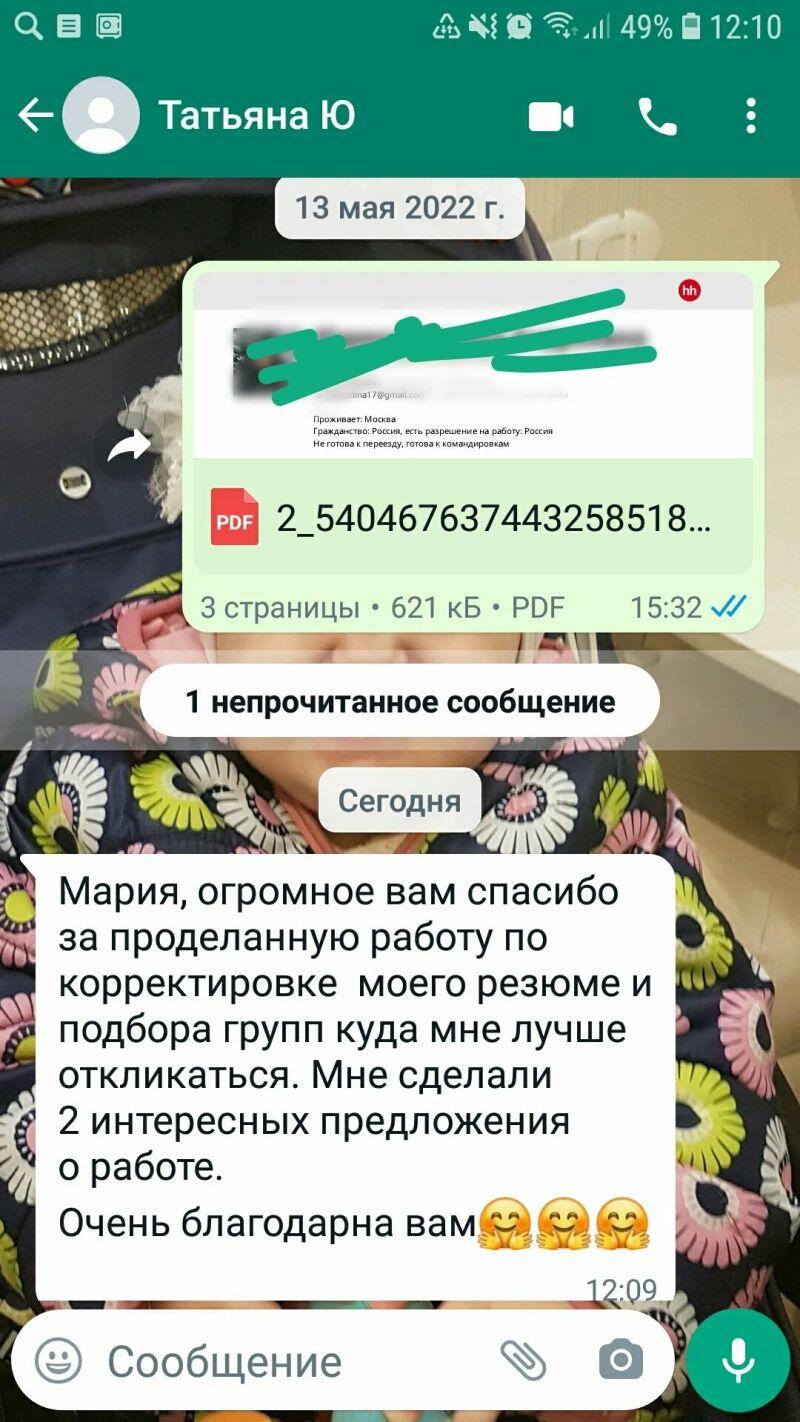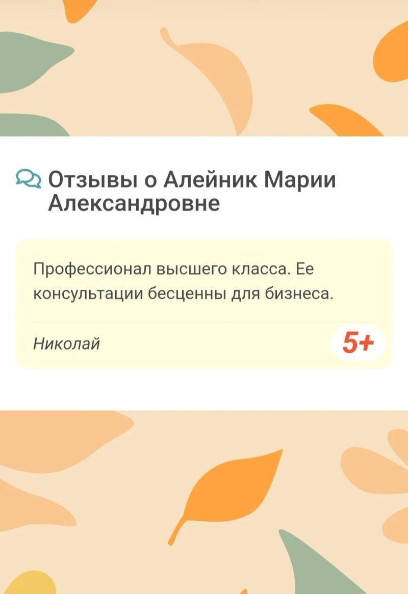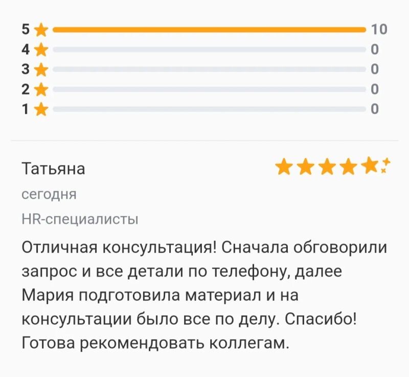 Отличная консультация! Сначала обговорили запрос и все детали по телефону, далее Мария подготовила материал и на консультации было все по делу. Спасибо! Готова рекомендовать коллегам.