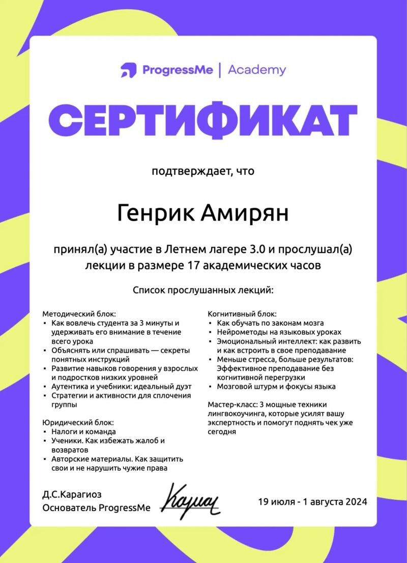 ► Амирян Генрик Арцрунович проводит занятия территориально: г. Ростов-на-Дону, а также дистанционно в онлайн-формате.