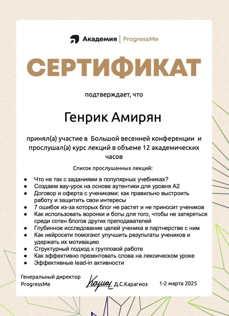 ► Связаться с Амиряном Генриком Арцруновичем можно за пару минут. Нажмите на кнопку «Связаться с репетитором» и заполните короткую форму.