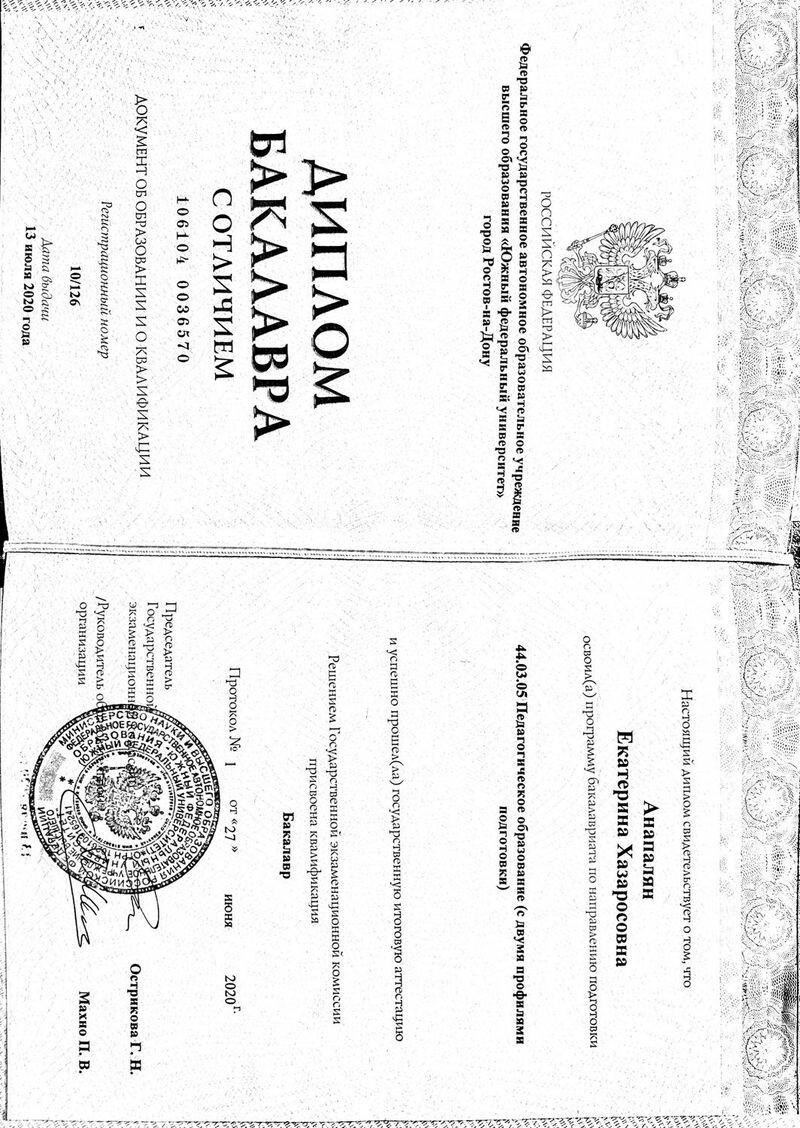 - Институт филологии, журналистики, межкультурных коммуникаций ЮФУ, направление – педагогическое образование (русский и английский языки), бакалавр, 2015–2020 гг.