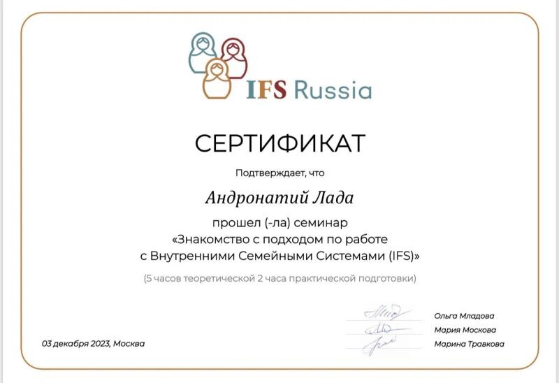 - IFS, семинар по теме «Знакомство с подходом в работе с внутренними семейными системами», 2023 г.