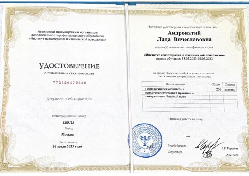 - Московский Институт Психотерапии и Клинической психологии. Специализация "Комплексный подход в психологическом консультировании", Другое, 256 часов, 2023–2023 гг.