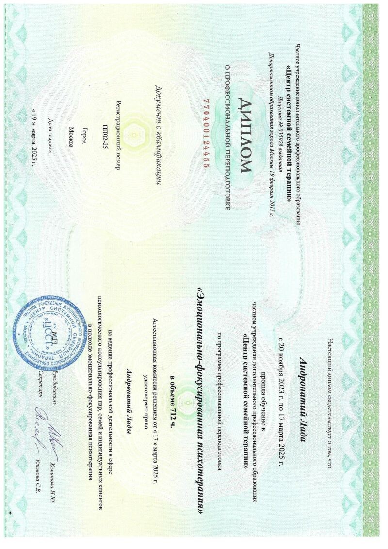 - ЧУ ДПО «Центр системной семейной терапии», профессиональная переподготовка по программе «Эмоционально-фокусированная психотерапия», Эмоционально-фокусированная терапия (ЭФТ), 712 часов, 2023–2025 гг.