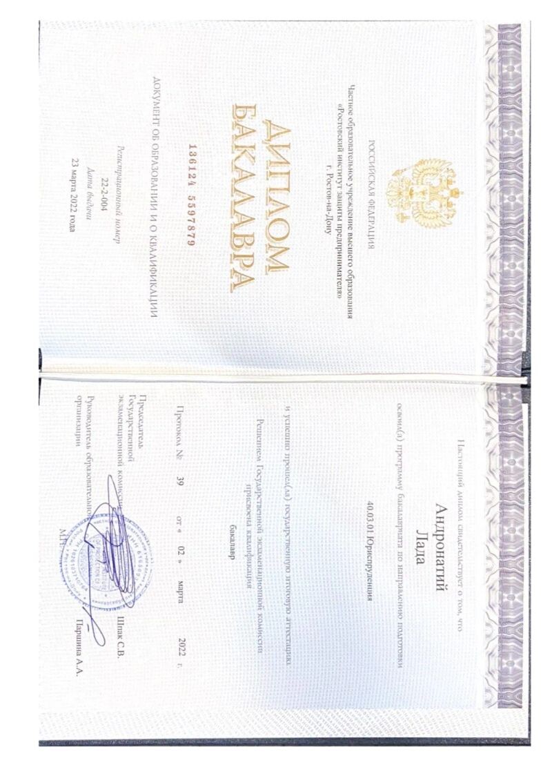 - Частное образовательное учреждение высшего образования «Ростовский институт защиты предпринимателя», юриспруденция, 2018–2022 гг.