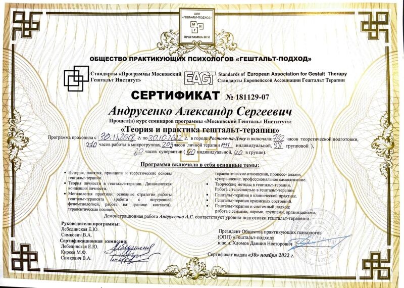 - Московский гештальт институт, программа «Теория и практика гештальт-терапии», 2018–2022 гг.