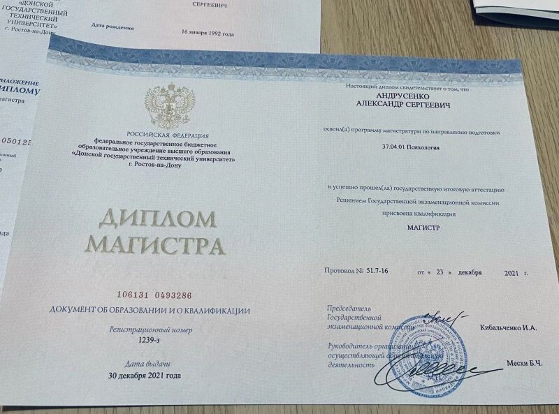 - ДГТУ, психология, магистр, 2019–2021 гг.