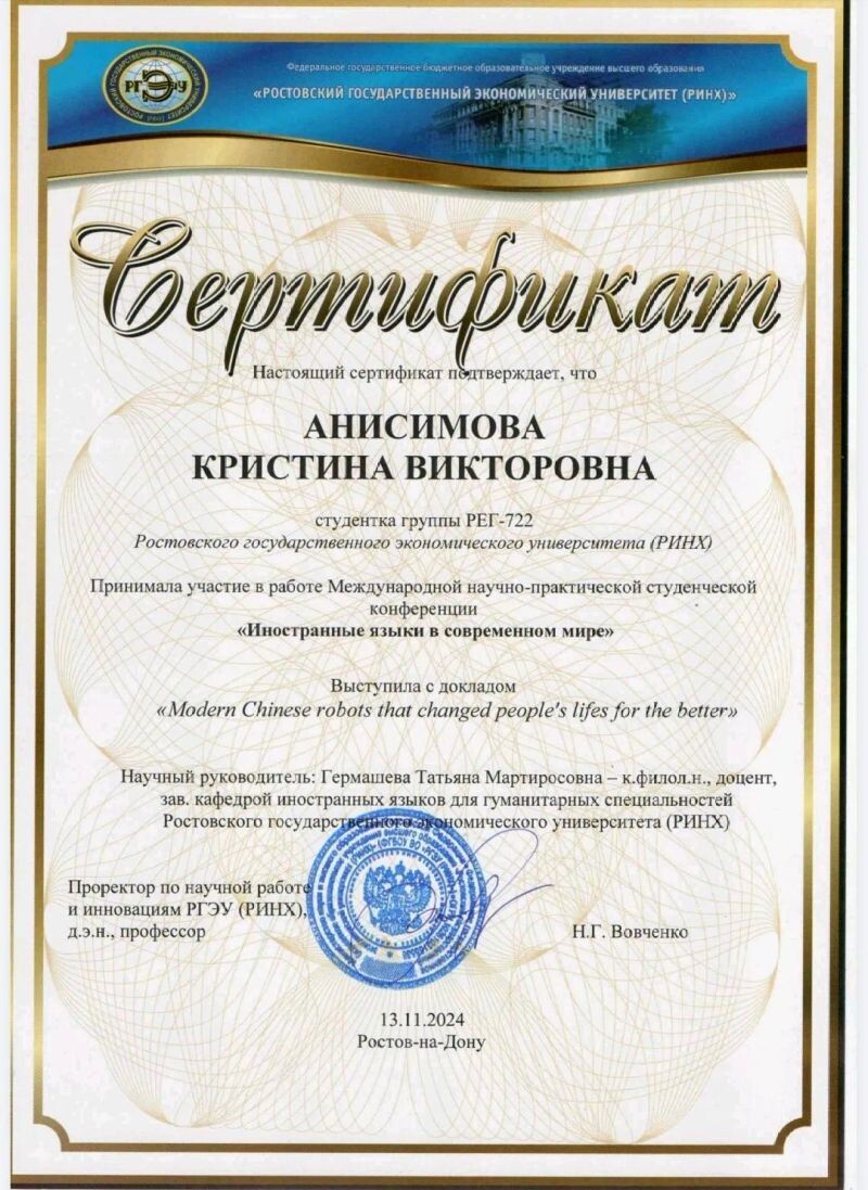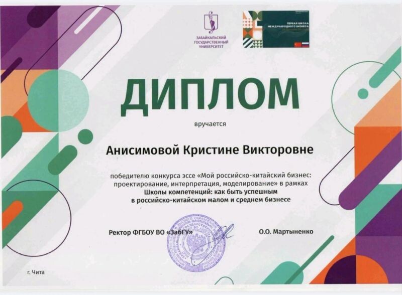 - ФГБОУ ВО «ЗабГУ», конкурс эссе «Мой российско-китайский бизнес: проектирование, интерпретация, моделирование» в рамках Школы компетенций: как быть успешным в российско-китайском малом и среднем бизнесе», 2024 г.