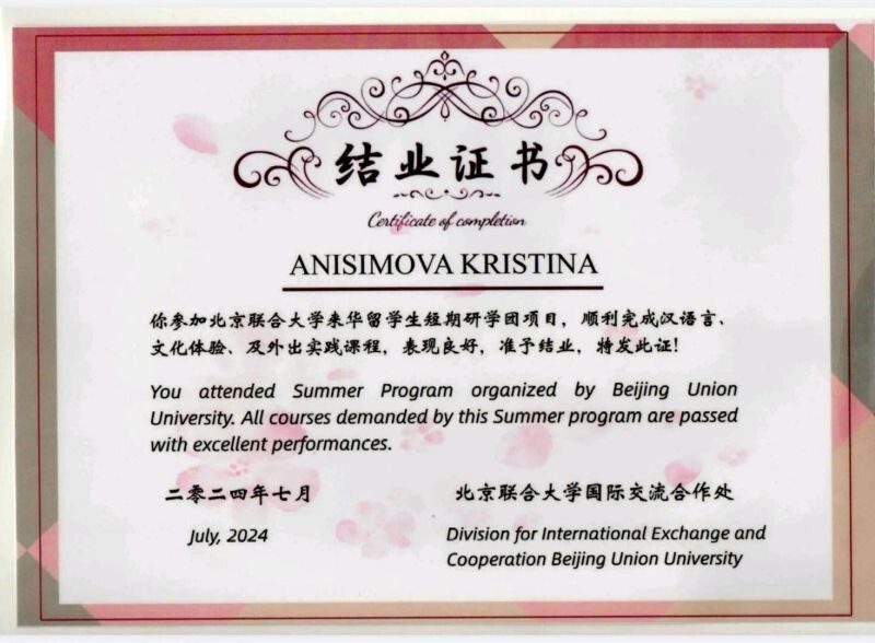 - Летняя стажировка в Пекинском объединённом университете (BUU) (с 2024 г.).